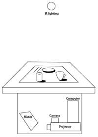 Dinner Party is an interactive installation in which a single chair and a place set for one person seems to provide a solitary dining experience. However, the interaction offers a communication between oneself and imaginary creatures. A participant sits down at an interactive table on which are placed several objects the participant can move as if she or he is about to enjoy a meal. The objects cast virtual shadows on the tabletop with animated creatures hiding in the shadows.