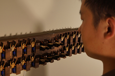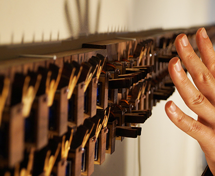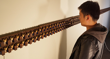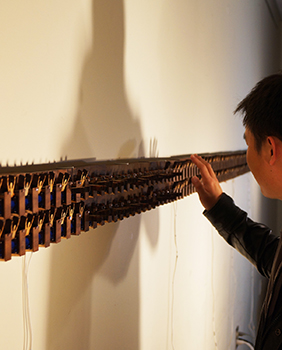 In the small room, Hooray, an interactive installation, is installed on three walls with a video installed on the fourth wall. There is one bright light source in the middle of the room to make participants’ shadows for interacting with Hooray. In Hooray, 208 human figures in double rows are initially standing up. When participants approach Hooray, the figures individually bow. To accomplish this effect, when the participants’ shadows block light sensors, motors are activated that cause the figures to bow. In my video, I bow and try to keep smiling for 10 minutes while gradually getting tired of bowing.