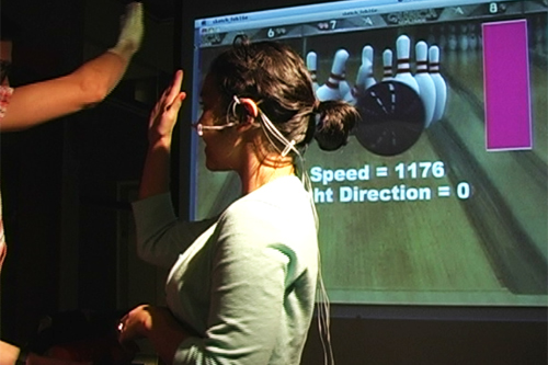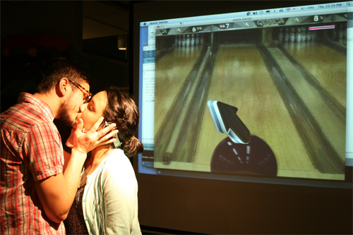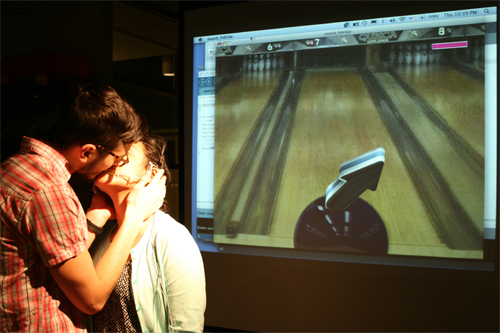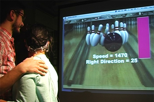 One person has a magnet on his/her tongue and the other person wears the headset. While they kiss, the person who has the magnet on his/her tongue, controls the direction and speed of the bowling ball for 20 seconds. The goals of this game are to guide the ball so that it maintains an average position in the center of the alley and to increase the speed of the ball by moving the tongue faster while kissing.