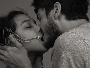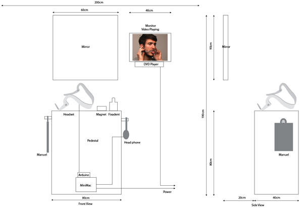The Tongue Music interface has two components: a customized headset that functions as sensor receiver and a magnet that provides sensor input: magnetic field sensors are attached to the end of the headset, positioned in front of the mouth and the participant affixes a magnet to her tongue with Fixodent. As the participant moves her tongue, this creates varying magnetic fields, which are used to generate a variety of rhythmic tunes. Tongue Music can be played by one participant. But as with kissing, the performance is more engaging when two participants share the interface. When there are two performers, one person wears the headset and the other attaches the magnet to her tongue. The performers then kiss to create sounds as a collaborative affair. Through this interaction, a kiss is translated into music.
