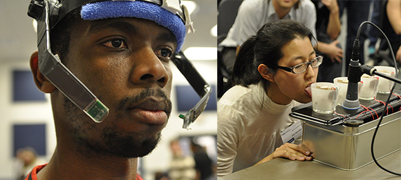 -The first component is a Tongue-Computer Interface, known as the Tongue Drive System. The headset possesses sensors that detect magnetic flux emanating from a small magnet secured on the tongue with tissue adhesive. These sensor readings are wirelessly transmitted to the computer. A signal-processing algorithm converts the readings into mouse commands that are then employed by the audio/video production system.