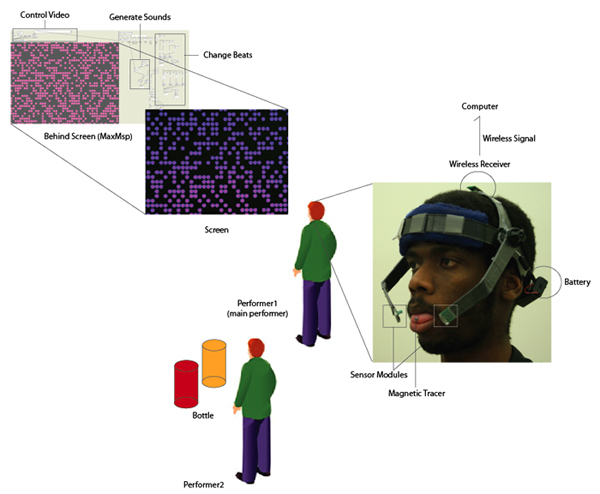 The Tongue Music system consists of three components: a bio-computer interface, an audio/video production system and four bottles for creating piano beats.